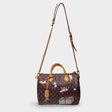 A luxurious Louis Vuitton x Grace Coddington handbag featuring the brand's signature monogram coated canvas. It is decorated with artistic patches of animals and treasure chests, adding a playful touch to a classic design. It features a structured silhouette with gold-tone hardware, and a detachable, adjustable strap for crossbody or shoulder wear.