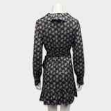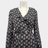 Miu Miu Black Silk Wrap Dress With Floral Pattern and Ruffles