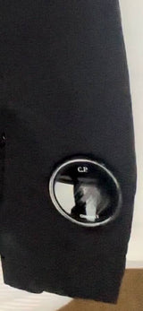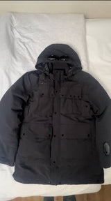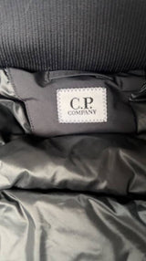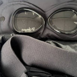 C.P Company men's black nylon down puffer jacket with hood and goggles