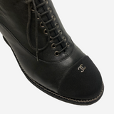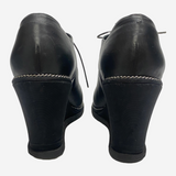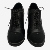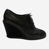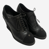 Chanel women's black lace up leather fabric wedges with metal CC and chain