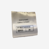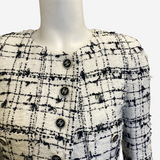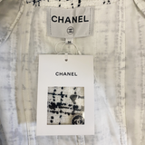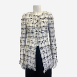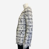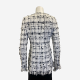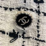 Chanel women's black and white tweed jacket with distressed cuffs and CC logo buttons