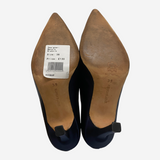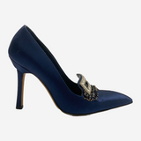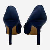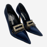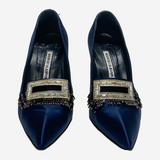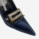 Manolo Blahnik blue vintage satin heels with crystal buckle and fringe