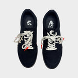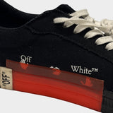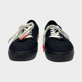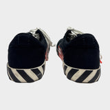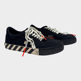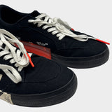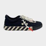 Step into style with these Off-White sneakers, featuring a bold arrow logo that captures attention effortlessly. The black canvas body is accented by striking white laces and unmistakable diagonal stripes along the midsole, creating a perfect blend of casual and cutting-edge design. Known for its fashion-forward approach, Off-White continues to redefine urban aesthetics, making these sneakers an essential addition to any modern wardrobe. Pair them with your favorite streetwear ensemble or let them stand out against a muted palette. Versatile and iconic, these shoes are more than just footwear—they're statements on the move. Elevate your everyday look with a touch of high-fashion flair.