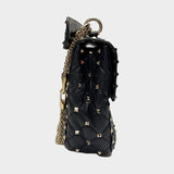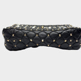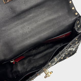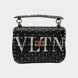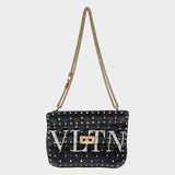This Valentino handbag showcases a perfect blend of elegance and edge with its luxurious black leather design, embellished with signature rockstuds. The bold VLTN logo adds a modern twist, making it a statement piece for any fashion-forward individual. Its compact size is complemented by a chic chain strap, offering both versatility and style. Ideal for elevating everyday outfits or completing a sophisticated evening look, this bag effortlessly exemplifies Italian craftsmanship. A must-have for those who appreciate timeless fashion with a contemporary flair.